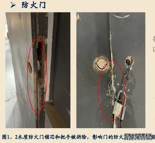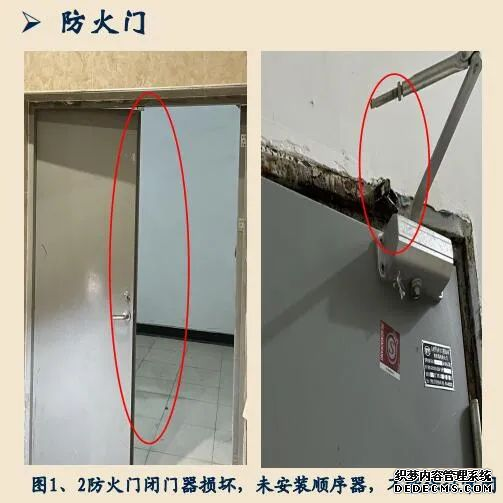 3、常见问题 防火门闭门器损坏、双扇防火门未安装顺序器,楼梯间的防火门不能保证常闭。