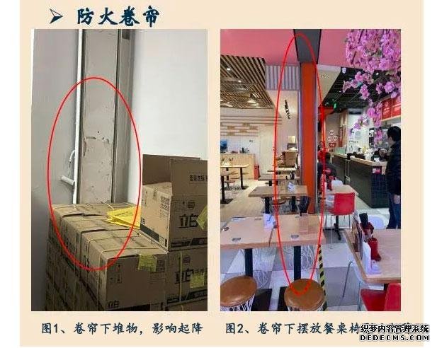 4、常见问题 在防火卷帘正下方堆物或被占用,影响防火卷帘在火灾情况下正常降落。
