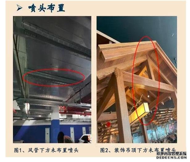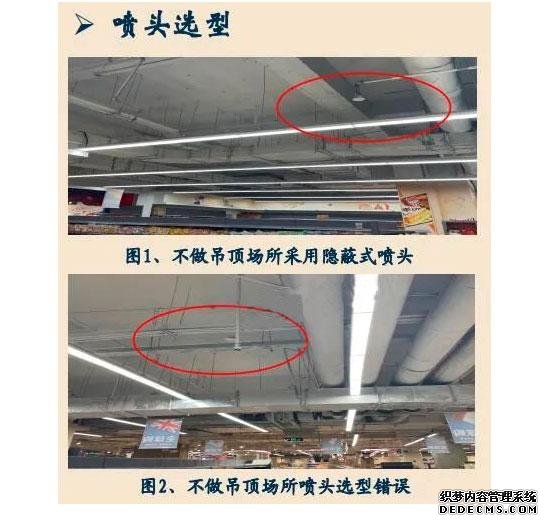 13、常见问题 不做吊顶的场所采用隐蔽式喷头或是喷头选型错误,影响喷头在火灾时正常动作。