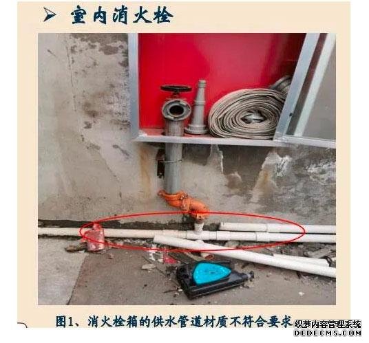 19、常见问题 消火栓的供水管道使用PVC管,管道材质不满足耐腐蚀性和耐火性能等要求。